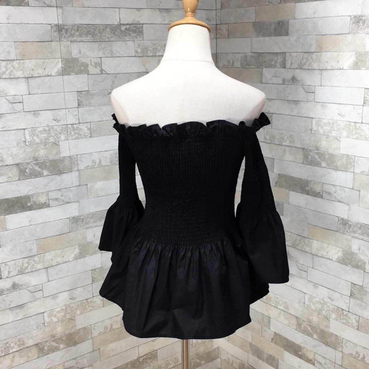 オフショル フリル ボリューム袖 七分袖 トップス レディース ブラック 無地 Tシャツ | キャノン