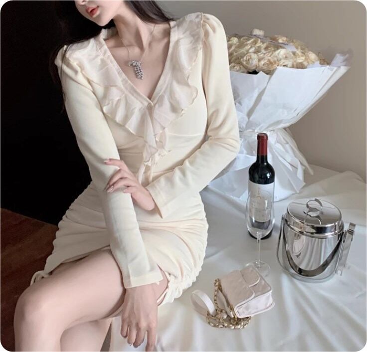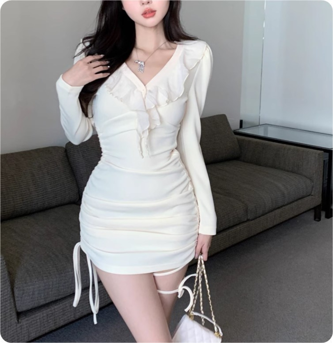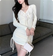 長袖 ミニワンピース タイト フリルネック シャーリング ショートスカート レディース 無地 ドレス