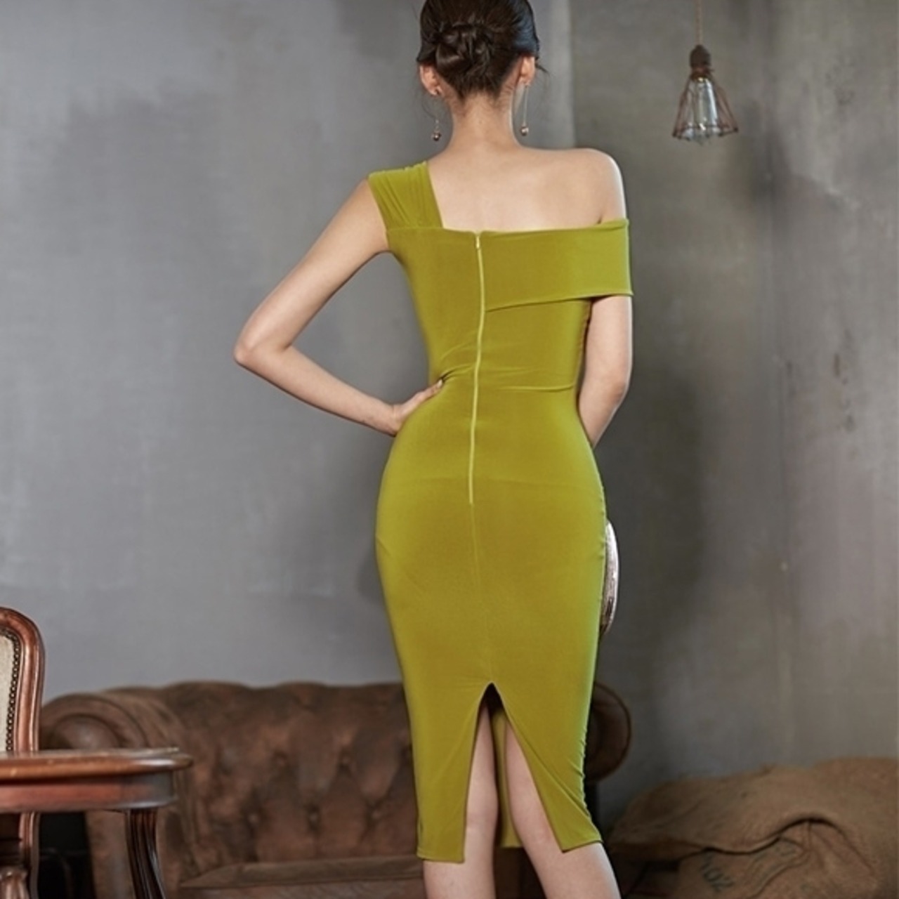 ワンショルダー アシンメトリー ワンピース レディース グリーン ロングスカート パーティー ドレス